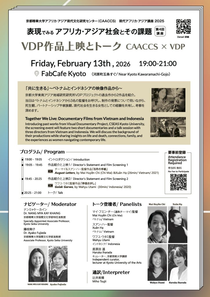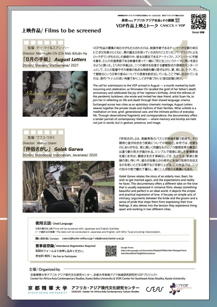 京都大学東南アジア地域研究研究所VDPプロジェクト(https://vdp.cseas.kyoto-u.ac.jp/)の過去作から2作品を紹介。当日はベトナムとインドネシアから3名の監督をお呼びし、制作の背景について伺いながら、死生観、パートナーシップや家族観、現代社会を生きる女性としての経験を共有し、考察を深めます。